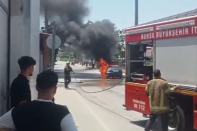 Bursa'da 40 dereceyi bulan hava sıcaklığında bir otomobil alev alev yandı.