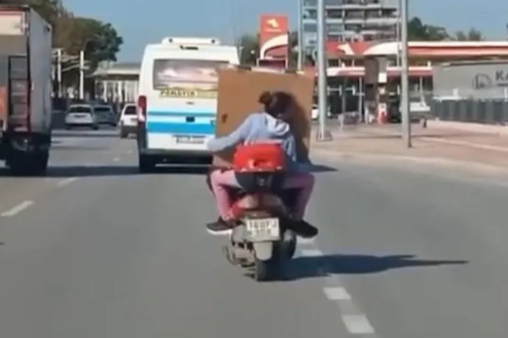 Bursa’nın Yıldırım ilçesinde anayola çıkan bir motosiklet sürücüsü arkasına aldığı kız çocuğuna eşya taşıttı. Kask takmadan kilometrelerce ilerleyen sürücü hem kendi, hem de arkasındaki küçük kız çocuğunu düşünmeden ilerlerken, tehlikeli yolculuk trafikteki vatandaşların kamerasına yansıdı.