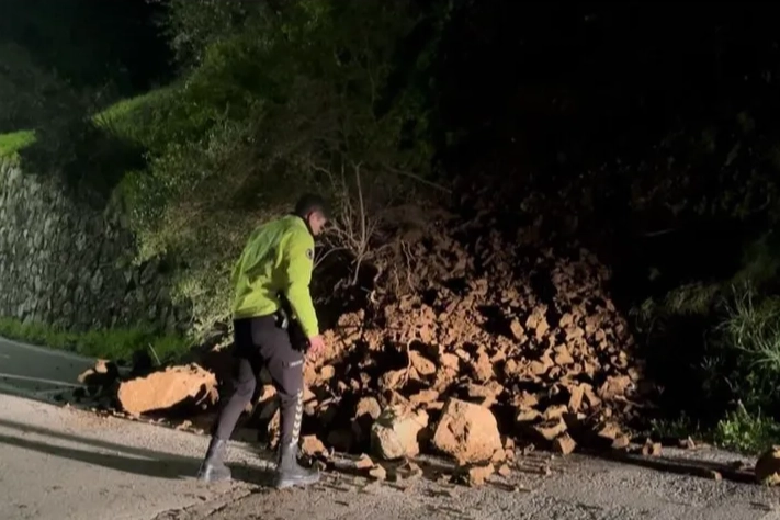 Bursa'nın Nilüfer ilçesinde meydana gelen toprak kayması nedeniyle, kayalıklar yola savruldu. Bir sürücü kazadan kıl payı kaçarken o anlar kameraya yansıdı.