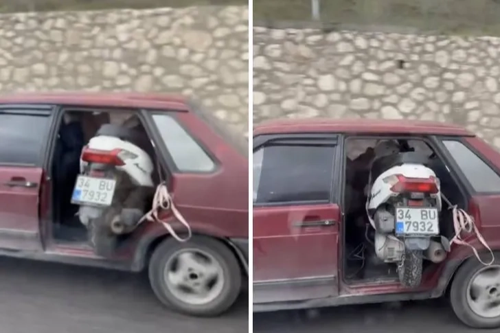 Bursa'da cadde üzerinde kapısız araçla trafiğe çıkan sürücü, arka koltuğa koyduğu motosikleti taşıdı. Trafiği tehlikeye düşüren sürücüyü görenler şaşkına dönerken, bazı sürücüler o anları amatör kamerayla kayda aldı. Kilometrelerce ilerleyen sürücü bir süre sonra kayıplara karışırken, görüntüler üzerine Trafik Şube Müdürlüğü ekipleri harekete geçti.