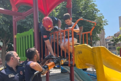 Olay, İnegöl'de saat 11.30 sıralarında Kamer Sokak'ta bulunan çocuk parkında meydana geldi. Edinilen bilgilere göre, 8 yaşındaki Y.B., karnesini aldıktan sonra arkadaşlarıyla birlikte parkta oyun oynamaya başladı. Oyun oynarken kaydırağın yan kısmındaki korkuluklara dizleri sıkışan çocuğun çığlıklarına çevredekiler koştu. İhbar üzerine olay yerine itfaiye ekipleri sevk edilirken, daha fazla ayakta duramayan çocuğun altına esnaftan alınan sandalye konuldu.