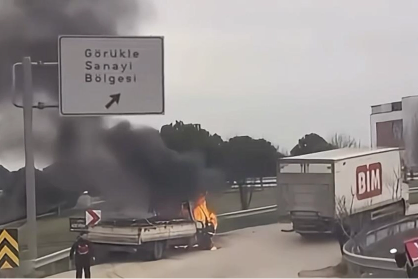 Bursa'da İzmir Yolu üzerinde Görükle dönüş kavşağında seyir halindeki bir kamyonette yangın çıktı.