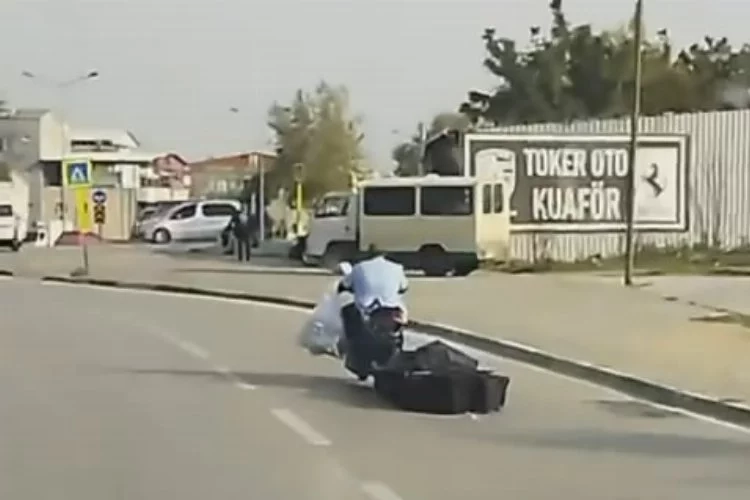 Olay, merkez Osmangazi ilçesine bağlı Küçükbalıklı mahallesi mevkiinde meydana geldi. Motosiklet sürücüsü, iki tekerlekli aracının arkasına plastik kasaları bağlayıp trafiği çıktı. Kendi canını bile hiçe sayan motosiklet sürücüsü yolculuğuna dakikalarca devam etti. Tehlikeli yolculuk trafikteki vatandaşların kamerasına yansırken, o anları bazı vatandaşlar şaşkınlıkla izledi.