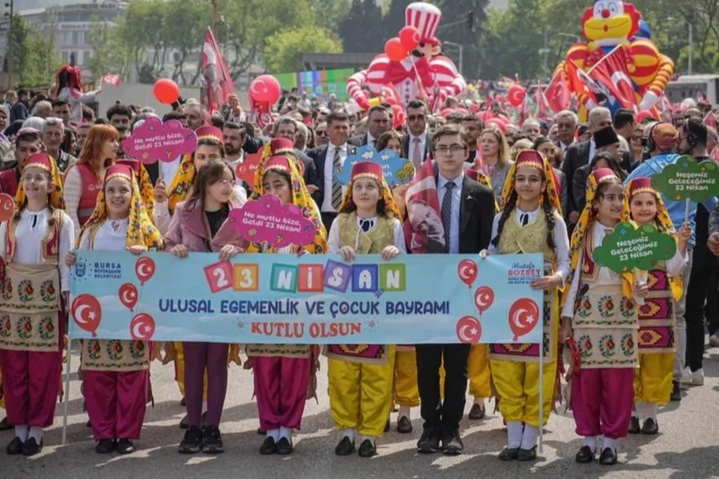 23 Nisan Ulusal Egemenlik ve Çocuk Bayramı tüm Türkiye'de olduğu gibi Bursa'da da büyük bir coşkuyla kutlandı. Bursa Büyükşehir Belediyesi tarafından 'Onların Gülüşü Hepimizin Yarını' teması ile hazırlanan '23 Nisan Çocuk Şenliği'nde çocuklar, dolu dolu program içeriğiyle unutulmaz bir gün geçirdi. 23 Nisan coşkusu, yüzlerce çocuk ve ailelerinin katılımıyla Altıparmak Caddesi'nden Merinos Parkı'na doğru yapılan kortej yürüyüşüyle başladı. Ellerindeki Türk bayraklarıyla marşlar söyleyerek ve şiirler okuyarak yürüyen çocuklara, Büyükşehir Belediye Başkanı Mustafa Bozbey ve eşi Seden Bozbey ve CHP İl Başkanı Nihat Yeşiltaş da eşlik etti.
