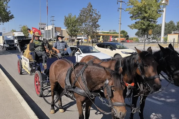 151 gündür yolda olan çiftçiler, üç atın çektiği arabalarıyla Bursa’nın İnegöl ilçesinden geçti. Yol boyunca çeşitli şehirlerde insanlarla buluşan ikili, barış ve dostluk mesajı veriyor. Amaçlarının savaşın acılarını unutturmamak ve dinler arası barışa katkı sağlamak olduğunu belirten Heinz Bley, yaptığı açıklamada şunları söyledi: "Ben Heinz ve arkadaşım Friedrich Gernike. Biz Berlin’de iki çiftçiyiz. Menzilimiz Kudüs. Atlarımızla bu uzun yolculuğu barış için yapıyoruz. Yanımızda dökümden yapılmış küçük bir çan var. Onu Kudüs’teki bir okula kendi ellerimizle teslim edeceğiz."