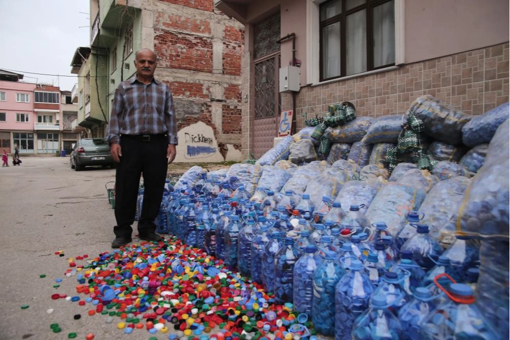 Bursa’nın merkez Osmangazi ilçesinde yaşayan 2 çocuk babası Nazım Gökçe emekli olduktan sonra hayatını yardım işlerine adadı. 2011 yılından bu yana sokak sokak gezerek kapak toplayan yardımsever adam topladığı kapakları biriktirerek geri dönüşüm merkezlerine satıyor. Elde ettiği gelirle engelli dernekleri ve üniversitede okuyan öğrencilere bağışlıyor. Yaklaşık 1 ton ağırlığında kapak toplayan 60 yaşındaki Gökçe, biriktirdiği kapakları evinin önünde sergiledi. Sokak dolusu kapakları satarak tekerlekli sandalye aldığını belirten Gökçe, ilgili derneklere bağışlayarak bir engelliyi sevindirmek istediğini söyledi. Hayatını hayır işlerine adayan Gökçe, “2010 yılında emekli oldum. 2011 yılından bu yana kapak topluyorum. Engellilere yardım ederek başladım. Bir yandan kapak topladım. Tonlarca atığı geri dönüşüme kazandırdım. Topladığım kapaklarla tekerlekli sandalye aldım. Burada 1 milyondan fazla kapak var, ağırlık olarak 1 ton civarında. Bu kapakları 2 senede topladım. Daha önceki yıllarda 1 milyon kapağı 3 yılda toplamıştım. Bu güne kadar toplam 6 ila 7 milyon arası kapak topladım. Hep tek başıma mücadele ettim. Bazen 20 kilometre gidip geldiğim günler oldu. Kapakları geri dönüşümcülere satıyorum. Elde ettiğim parayla tekerlekli sandalye alıyorum. Birazını da kendi cebimden veriyorum. Bu güne kadar 4 tekerlekli sandalye aldım. Engellilere yardım amaçlı aldığım için bana indirim de yapıyorlar. Elimden geldiğimce herkese yardım ediyorum” şeklinde konuştu.