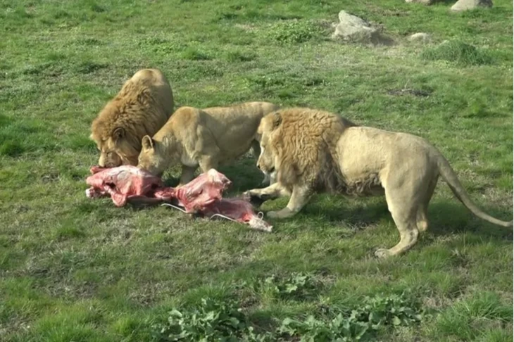 Böyle bir deneyimi daha önce hiç yaşamadıklarını belirten aile, çok heyecan duyduklarını, izlemenin ise keyifli olduğunu söyledi. Yaklaşık 206 bin metrekarelik bir saha üzerine kurulu bulunan Bursa Hayvanat Bahçesi'nde bir aslanın günde ortalama 5-6 kilogram et yediğini belirten yetkililer, günün bir kısmını dinlenerek geçiren bu vahşi kedilerin beslenme ve davranış zenginleştirme programına tabi tutulduğunu söyledi. Aslanların hayvanat bahçesinde veteriner, biyolog ve yetkililer tarafından kalorileri tek tek hesaplanan gıdalarla beslendiğini belirtirken, bugün verilen 75 kilo karkas eti yerken büyük keyif duyduklarını dile getirdi.