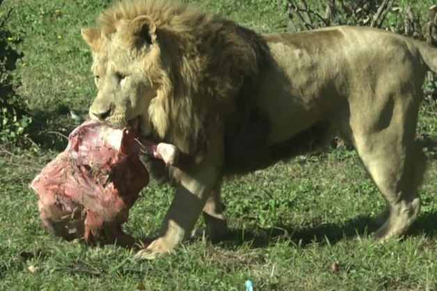 Bursa Hayvanat Bahçesi'ndeki hayvanların hareketlenmesi için farklı yöntemlerle yapılan besleme egzersizleri nefesleri kesti. Bulundukları barınaklarından çıkan aslanlar, karkas olarak bırakılan yaklaşık 50 kiloluk eti kısa sürede parçaladı.