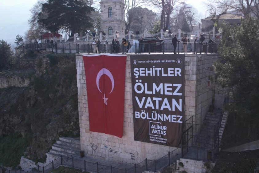 Belediye tarafından Osmanlı İmparatorluğu'nun kurucusu Osmangazi ve oğlu Orhangazi'nin türbelerinin bulunduğu 2700 yıllık Tophane surlarına Türk Bayrağı ve üzerinde “Şehitler ölmez vatan bölünmez” yazılı pankart asıldı. Bursa’nın önemli bir kısmından görülen pankart havadan görüntülendi.