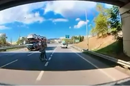 Olay, Bursa-Yalova yolu üzerinde meydana geldi. Hızla ilerleyen araçlar, karşısında bisikletli vatandaşı görünce ne yapacağını şaşırdı. Kamyonların ve otomobillerin arasında sahilde yürürcesine ilerleyen bisikletli kişinin o anları bir otomobilin araç içi kamerasına yansıdı.
