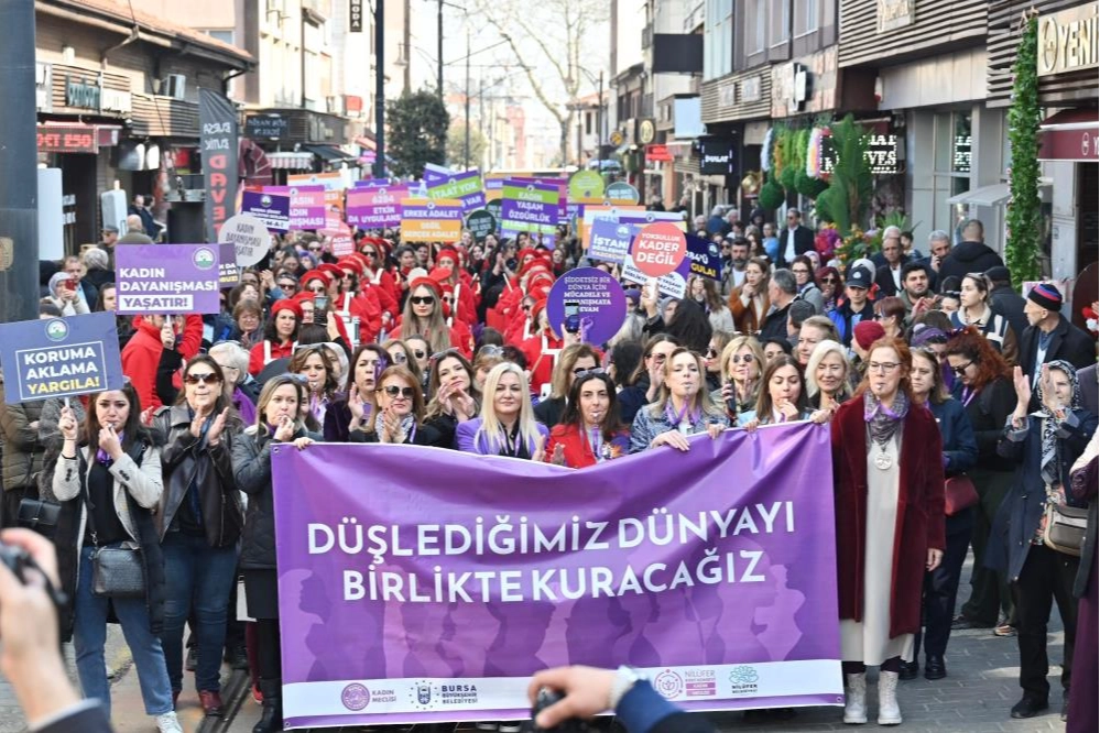 Bursa Büyükşehir Belediyesi ve Bursa Kent Konseyi iş birliğinde 8 Mart Dünya Kadınlar Günü dolayısıyla birbirinden renkli etkinlikler düzenlendi. Programlar, Park ve Bahçeler Dairesi Başkanlığı Kent Estetiği Şube Müdürlüğü tarafından Orhangazi Parkı’nda hazırlanan Playwood etkinliği ile başladı. Etkinliğe katılan kadınlar, dileklerini, isteklerini ve vermek istedikleri mesajları not kağıdına yazıp panoya yapıştırdı. Bursalı kadınlar daha sonra Barış Kadın Bandosu eşliğinde ‘Düşlediğimiz dünyayı birlikte kuracağız’ diyerek Cumhuriyet Caddesi’nden Hanlar Bölgesi’ne kadar yürüdü. Bursa Büyükşehir Belediyesi’nin destekleriyle düzenlenen yürüyüşe, Seden Bozbey, Nadire Aydın, Nuray Özdemir, CHP Bursa Milletvekili Nurhayat Altaca Kayışoğlu, Bursa Kent Konseyi Genel Sekreteri Elvan Atay Özkan, Bursa Büyükşehir Belediyesi’nin kadın bürokratları, çeşitli sivil toplum kuruluşları temsilcileri ve kadınlar katıldı. Yürüyüşün ardından Hanlar Bölgesi’nde bir açıklama yapan Bursa Kent Konseyi Kadın Meclisi Başkanı Derya Şimşek Aksakal, kadınların birbirine gönülden bağlı olduğunu vurguladı. Düşledikleri dünyayı birlikte kuracaklarını söyleyen Aksakal, "Ne olursa olsun el ele ve omuz omuza vererek eşit ve adil bir yaşamda mutlaka buluşacağız. Güvenle yaşadığımız evlerimiz, sokaklarımız ve kentlerimiz olacak. Düşlerimiz gerçeğe dönene kadar vazgeçmeyeceğiz, pes etmeyeceğiz" dedi. Konuşmaların ardından Büyükşehir Belediyesi Kadın Master Ritim Grubu eşliğinde çeşitli atölyeler düzenlendi. Bursalı kadınlar, ‘Seslerimiz Yankılanıyor’ isimli açık mikrofon etkinliği, mesaj duvarı, kuyu etkinliği ve ateş çemberi etkinlikleri ile daha eşit, adil ve özgür bir dünya taleplerini yüksek sesle dile getirdi.