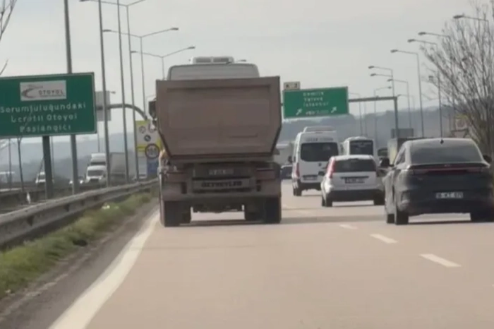 Bursa Çevre Yolu'nda seyir halinde olan bir hafriyat kamyonu, uzun araçların geçişine yasak olan en sol şeride girerek bir süre ilerledi. Kamyon sürücüsü trafik güvenliğini tehlikeye düşürerek, süratli şekilde yoluna devam etti.