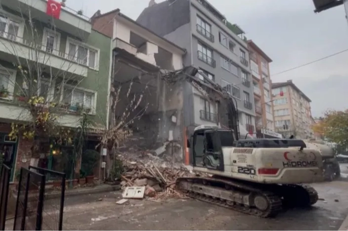 Bursa'da yeni yapı için yıkılacak olan 4 katlı eski bina, iş makinesi tarafından ilginç yöntemle yerle bir edildi. Binanın çatısından başlayacağına, zemininden başlayınca ortalık savaş alanına döndü.