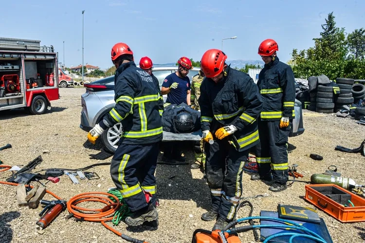 Küçükbalıklı'daki İtfaiye Eğitim Merkezi'nde yangına müdahale, arama kurtarma gibi çeşitli konularda uygulama yapılırken, senaryo gereği trafik kazası sonucu araç içinde sıkışan kazazedenin kurtarılması takibatı da gerçeği aratmadı.