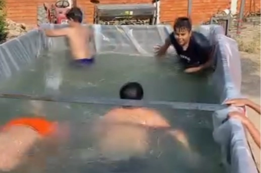 Bursa'nın Yenişehir ilçesinde sahibi olduğu kamyonun kasasını naylon ile kaplayıp içerisine su dolduran bir vatandaş kamyonu çocuklar için yüzme havuzu haline getirdi.