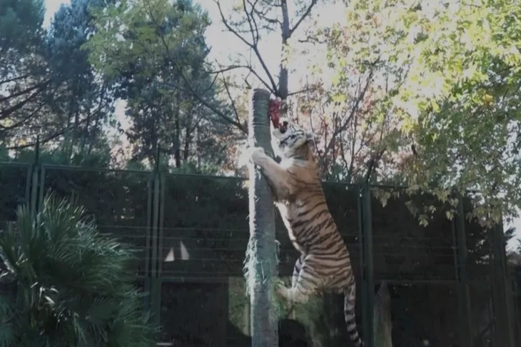Tek sıçrayışta eti kaptı Direğin üzerine bakıcısı tarafından asılan etin kokusunu alan amur kaplanı, yuvasından çıktıktan sonra gözüne kestirdiği eti tek hamlede kaptı. Afiyetle etini yiyen kaplan, bu egzersizlerle ormanda yaşamış gibi zinde ve çevik kalıyor.