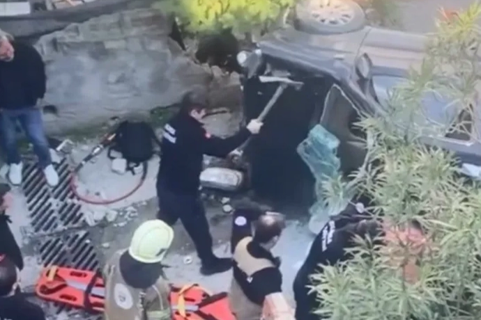 Bursa'da kaza yapan araç merdivenlerden yuvarlandı