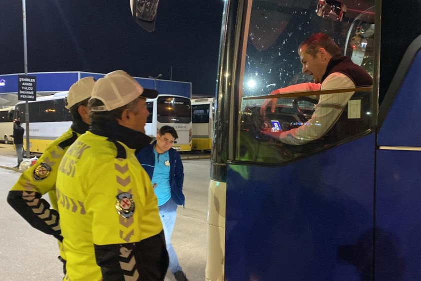 İnegöl'de trafik ekipleri, İnegöl Şehirlerarası Otobüs Terminali'nde şehirlerarası yolcu taşıyan otobüslere yönelik denetim yaptı. Vatandaşların bayram tatilinde güvenli yolculuk yapmalarını sağlamak için İnegöl Emniyet Müdürlüğü Trafik ekipleri, şehirlerarası yolcu taşıyan otobüslere yönelik uygulama yaptı. Uygulamada sürücülerin belgeleri kontrol edilirken, yolculara kemer kullanmaları konusunda uyarı yapıldı.