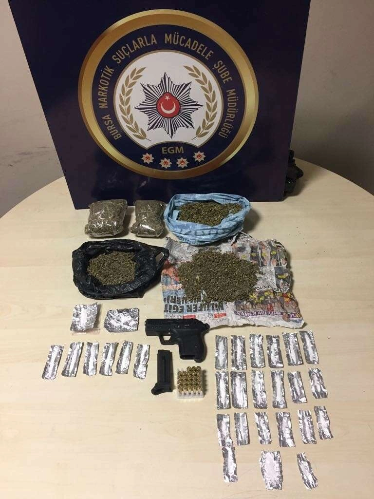 Osmangazi ve Yıldırım ilçelerinde 9 farklı adrese eş zamanlı operasyon düzenleyen narkotik polisi, uyuşturucu ticareti yapan 9 kişiyi yakaladı. Şahısların ikametlerinde, araçlarında ve üzerlerinde yapılan aramalarda 350 gram sentetik kannabinoid, satışa hazır vaziyette paketlenmiş 28 çıkı metamfetamin, bir adet ruhsatsız tabanca ve çok sayıda fişek ele geçirdi. Yakalanan toplam 9 şahıstan 3'ü hakkında kullanmak için uyuşturucu madde satın almak veya bulundurmak suçundan adli işlem yapıldı. 6 şahıs ise uyuşturucu veya uyarıcı ticareti yapmak suçundan gözaltına alınıp adliyeye sevk edildi.