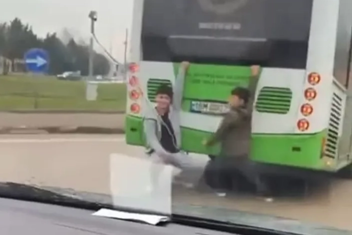 Seyir halindeki otobüsün arka bölümüne tutunarak ayaklarını yere süre çocuklar, uzun süre bu şekilde yolculuk yaptı. Tehlikeli anlar, çevredeki bir vatandaşın cep telefonu kamerasına saniye saniye yansıdı.