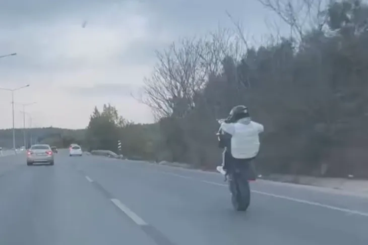 Bursa Mudanya Yolu merkez istikamet üzerinde seyir halindeki bir motosiklet sürücüsü yaptığı hareketle yürekleri ağza getirdi. Anayolda ilerleyen motosikletli tek teker üzerinde kilometrelerce seyretti. Hem kendinin hem de trafikteki diğer vatandaşların canını hiçe sayan sürücü, trafikteki diğer sürücülerin kamerasına yansıdı.