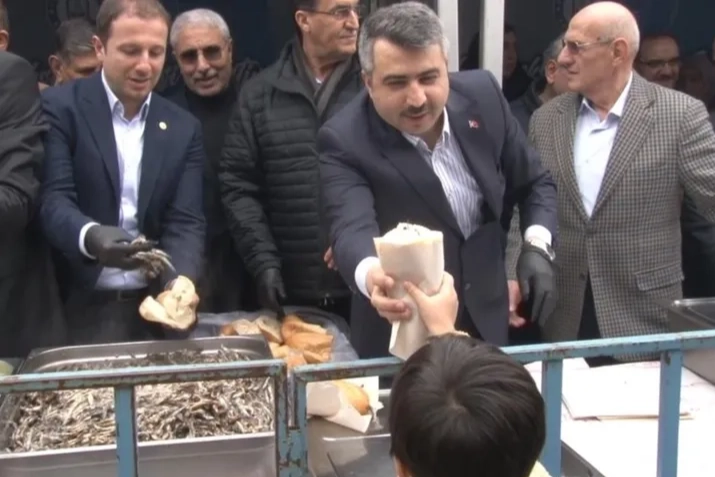 Hamsi dağıtımının ardından Yıldırım Belediye Başkanı Oktay Yılmaz ve Ak Parti İl Başkanı Davut Gürkan fotoğraf çektirerek horon oynadılar.