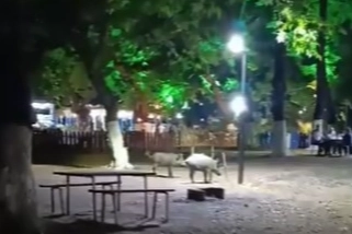 Bursa'nın Karacabey ilçesinde aç kalan domuzlar, insanların oturduğu park alanına indi. O anlar vatandaşlarca kaydedildi.
