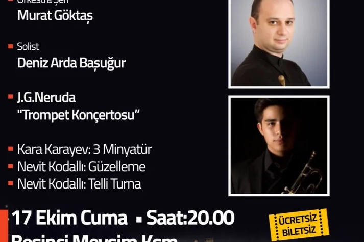 Konserin orkestra şefliğini Murat Göktaş, solistliğini ise genç trompet sanatçısı Deniz Arda Başuğur üstlenecek. Programda J. G. Neruda’nın “Trompet Konçertosu”, Kara Karayev’in “3 Minyatür” adlı eseri ile Türk bestecisi Nevit Kodallı’nın “Güzelleme” ve “Telli Turna” eserleri yer alacak.