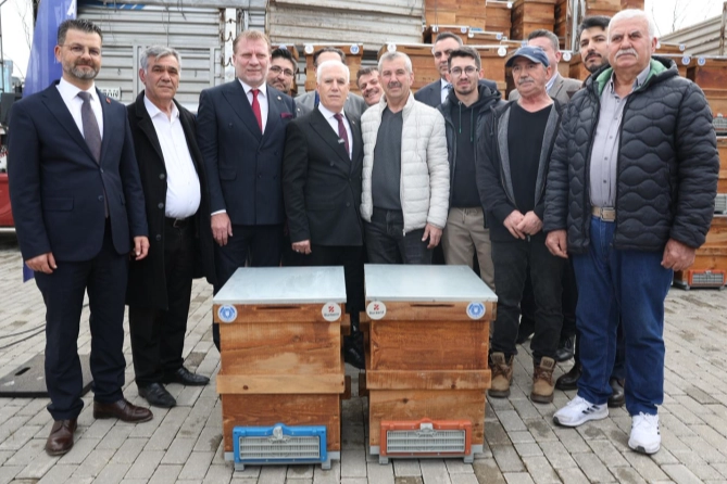 Konuşmaların ardından Başkan Mustafa Bozbey ve belediye yöneticileri tarafından üreticilere kovanları teslim edildi.