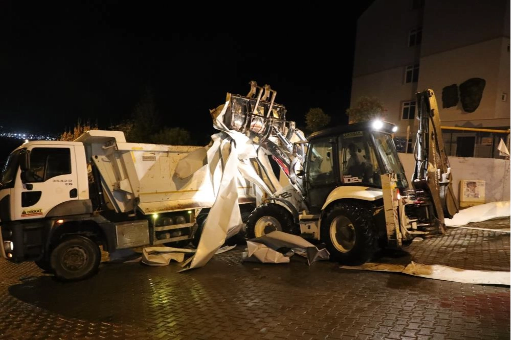 Gemlik’te akşam saatlerinde fırtınadan dolayı Cumhuriyet İlkokulu’nun çatısında bulunan kaplama uçarak çevrede bulunan araçlara zarar verdi. Belediye ekipleri kopan metal parçalar kamyonlara yükleyerek bölgeden uzaklaştırdı.