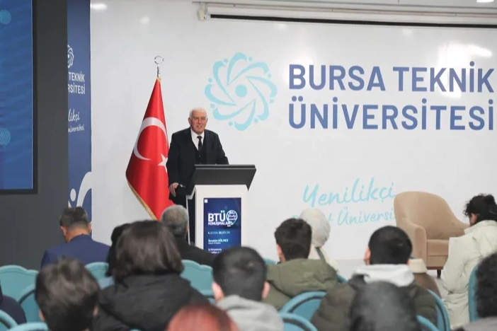 Bursa Teknik Üniversitesi öğrencileri, BTÜ Konuşmaları programıyla alanında uzman isimlerle buluşmaya devam ediyor. Bu doğrultuda her çarşamba günü Mimar Sinan Yerleşkesi Turkuaz Salon’da gerçekleşen BTÜ Konuşmaları’nın 4’ncü sezon 33’ncü bölüm konuğu, Haksan Otomotiv Yönetim Kurulu Başkanı İbrahim Gülmez oldu. Programa; BTÜ Rektörü Prof. Dr. Naci Çağlar, Rektör Yardımcıları Prof. Dr. Beyhan Bayhan ve Prof. Dr. Barış Tamer Tonguç, akademisyenler ile öğrenciler katıldı. “İş Dünyasında Tehditler ve Fırsatlar” başlıklı konuşmasını yapan Haksan Otomotiv Yönetim Kurulu Başkanı İbrahim Gülmez, sanayideki son gelişmeleri ve özel sektörde ihtiyaç duyulan mezun profilini paylaştı. Haksan Otomotiv’in BTÜ ile güçlü bir ilişkisi olduğunu vurgulayan İbrahim Gülmez, mühendislik ağırlıklı bölümlerin üniversite bünyesinde yer almasının sanayici için büyük öneme sahip olduğunu söyledi. Bursa’nın sanayi açısından büyük potansiyeller barındırdığını, özellikle otomotiv sektörünün öncü olduğunu ifade eden İbrahim Gülmez, mühendislik öğrencilerinin sanayi ile ilişkisinin artması gerektiğinin altını çizdi.