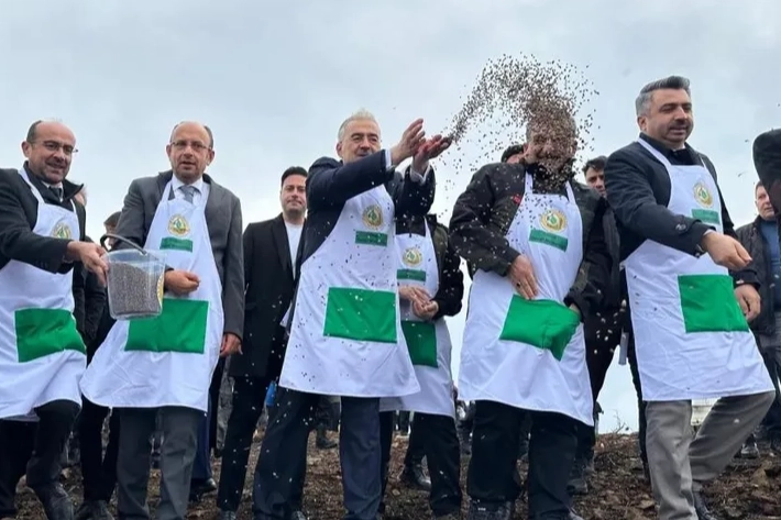 1 milyon 400 bin fidan dikildi Konuşmaların ardından Bursa Valisi Erol Ayyıldız, AK Parti İl Başkanı Davut Gürkan, Karacabey, Şahan, çocuklar ve diğer törene katılanlar, hazırlanan alana tohum serpti.