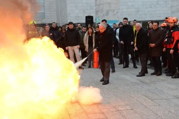 Başarılı şekilde gerçekleşen bina tahliyesinin ardından açık alanda kuru kimyevi tozla yangın söndürme tatbikatı yapıldı. Konuyla ilgili bilgilendirmenin ardından bina dışında uygulama gerçekleştirildi. Başkan Şadi Özdemir de yangın söndürme uygulaması yapanlar arasında yer aldı.