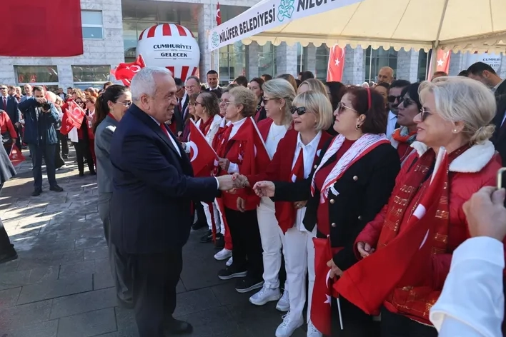 Saygı duruşu ve İstiklal Marşı'nın okunmasının ardından konuşan Nilüfer Belediye Başkanı Şadi Özdemir, "Bugün, bir milletin küllerinden yeniden doğduğu, özgürlüğü, eşitliği ve adaleti temel alan yeni bir yaşamı kurduğu büyük günün yıl dönümündeyiz" dedi.