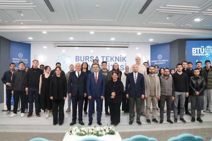 Bursa Teknik Üniversitesi öğrencileri, BTÜ Konuşmaları programıyla alanında uzman isimlerle buluşmaya devam ediyor. Bu doğrultuda her çarşamba günü Mimar Sinan Yerleşkesi Turkuaz Salon’da gerçekleşen BTÜ Konuşmaları’nın 4’ncü sezon 33’ncü bölüm konuğu, Haksan Otomotiv Yönetim Kurulu Başkanı İbrahim Gülmez oldu. Programa; BTÜ Rektörü Prof. Dr. Naci Çağlar, Rektör Yardımcıları Prof. Dr. Beyhan Bayhan ve Prof. Dr. Barış Tamer Tonguç, akademisyenler ile öğrenciler katıldı. “İş Dünyasında Tehditler ve Fırsatlar” başlıklı konuşmasını yapan Haksan Otomotiv Yönetim Kurulu Başkanı İbrahim Gülmez, sanayideki son gelişmeleri ve özel sektörde ihtiyaç duyulan mezun profilini paylaştı. Haksan Otomotiv’in BTÜ ile güçlü bir ilişkisi olduğunu vurgulayan İbrahim Gülmez, mühendislik ağırlıklı bölümlerin üniversite bünyesinde yer almasının sanayici için büyük öneme sahip olduğunu söyledi. Bursa’nın sanayi açısından büyük potansiyeller barındırdığını, özellikle otomotiv sektörünün öncü olduğunu ifade eden İbrahim Gülmez, mühendislik öğrencilerinin sanayi ile ilişkisinin artması gerektiğinin altını çizdi.