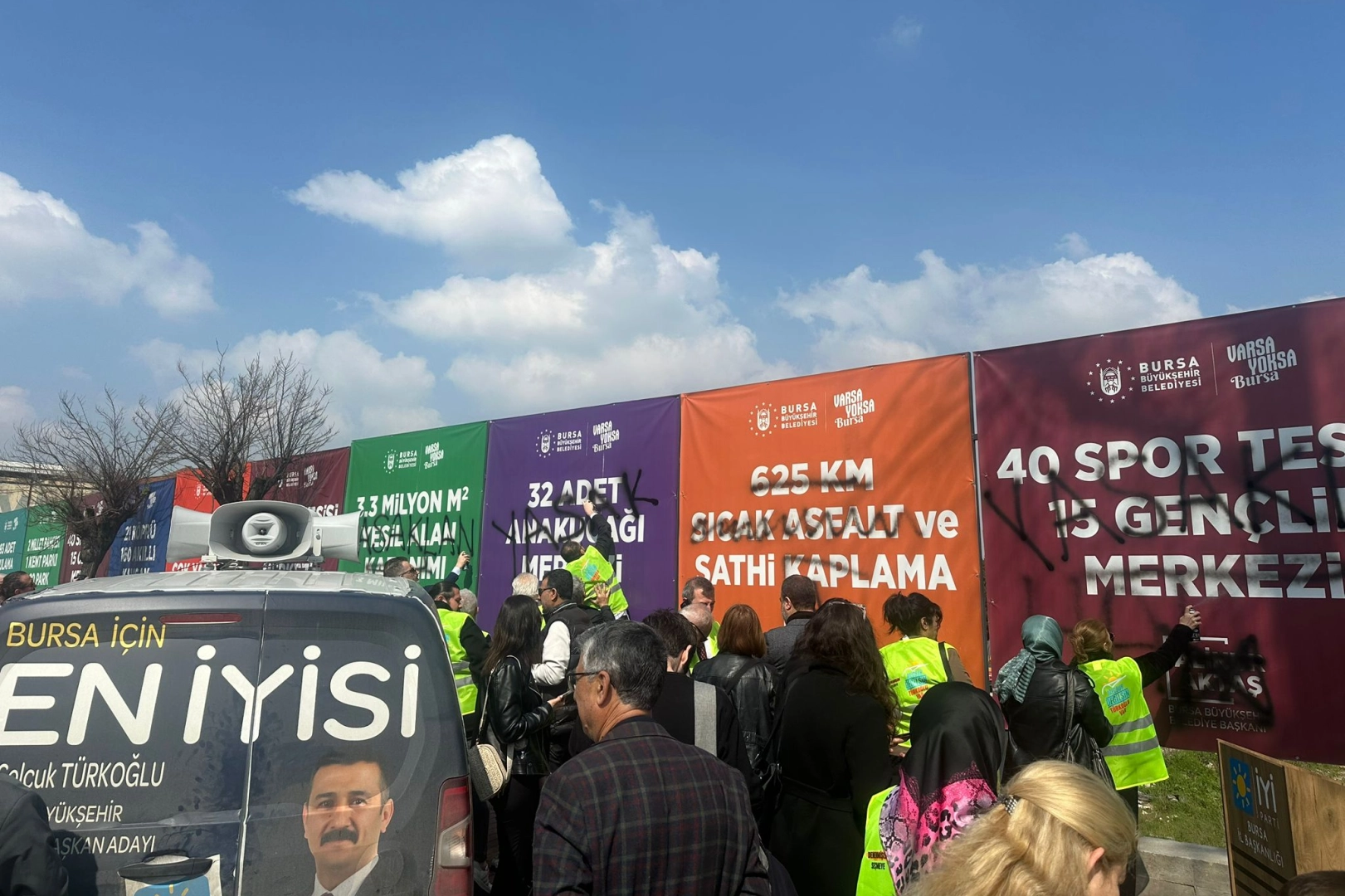 Yerel seçim sürecinde Sayın Cumhurbaşkanı Recep Tayyip Erdoğan tarafından yeniden aday gösterilen Bursa Büyükşehir Belediye Başkanı Alinur Aktaş’ın 6 yıllık süreçte Bursa’da hayata geçirdiği hizmetleri ve projelerini içeren tanıtım tabelalarına İyi Parti Büyükşehir Belediye Başkan adayı Selçuk Türkoğlu ve beraberindeki partililer tarafından 17 Mart 2024 Pazar günü sprey boya ile karalayarak provake edici sözler yazıldı. Gaziakdemir-Sıcaksu Kentsel Dönüşüm alanında bulunan, siyasi parti adı ve logosu bulunmayan, adaylıkla ilgili ifadelerin de yer almadığı tanıtım tabelalarının önünde basın açıklaması gerçekleştiren İyi Parti Büyükşehir Belediye Başkan adayı Selçuk Türkoğlu ve beraberindeki partililer, tanıtım tabelalarının afişlerini yırtarken üzerlerine de “kanunsuz, yasak ve kanma” gibi sözler yazdı.