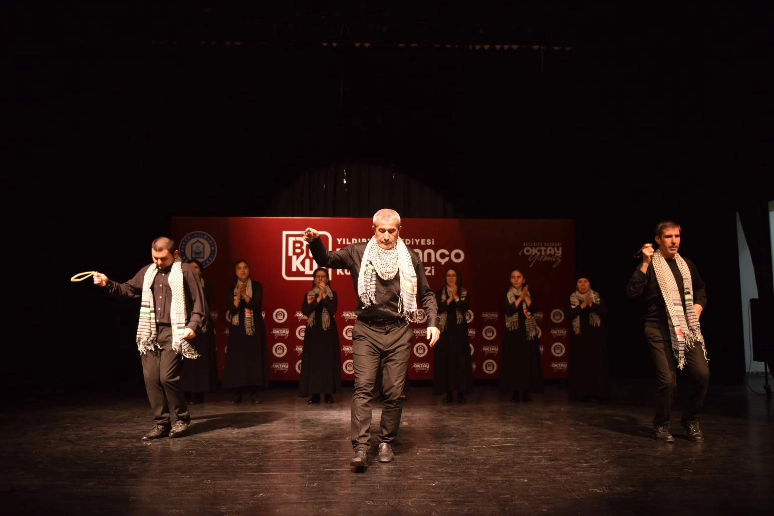 Yıldırım Belediyesi’nin ev sahipliğinde Tiyatro Ankebut tarafından sahneye konulan, Tiyatro Sanatçısı Nurdan Albamya İnce'nin yazıp oynadığı "Filistin Hakkında Konuşmalıyız" adlı tiyatro oyunu vatandaşlar tarafından büyük bir beğeni toplarken, oyundan etkilenen davetliler gözyaşlarını tutamadı. İşgalci İsrail güçleri tarafından evinden zorla çıkarılmaya çalışılan, bu uğurda büyük bir mücadele veren Filistinli Meryem Ebu Najma’nın gerçek hayat hikâyesini konu alan 70 dakikalık tek kişilik tiyatro oyunu baştan sona büyük bir ilgiyle izlendi. Filistinli Meryem’in hayatını sahneye taşıdığı oyunda; Filistin’de yaşanan ortak acıları, işlenen insanlık suçlarını ve Mescid-i Aksa’nın özgürlüğü için verilen mücadeleleri gözyaşları içinde izledi. Yıldırımlı tiyatro severler, oyunun sonunda Tiyatro Sanatçısı Nurdan Albamya İnce’yi yüksek performansını ayakta alkışlayarak ödüllendirdi. Yıldırım Belediyesi Başkan Yardımcısı Taner Taştekin, oyun sonunda sahneye çıkarak Nurdan Albamya İnce’ye çiçek takdim ederek performansından dolayı sanatçıyı tebrik etti. Yıldırım Belediye Başkanı Oktay Yılmaz, “Filistinli kardeşlerimizin her zaman yanındayız. 75 yıldır İsrail’in zulmü karşısında sadece ve sadece yüreklerindeki imanın gücüyle haklı mücadelesi ile bizlere örneklik gösteren, inançlarını ve vatanlarını savunurken şehit düşen kardeşlerimize rabbimden rahmet diliyor ve bu mücadelede yaralanan gazilerimize acil şifalar diliyorum. İnsanlığın ve Müslümanların haysiyetini koruma görevini üstlenen onurlu Filistin halkına şükranlarımı sunuyorum” dedi.