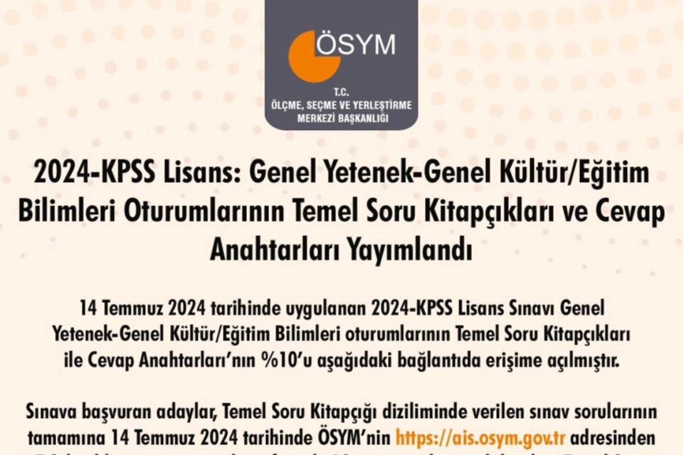 ÖSYM, 2024-KPSS Lisans, Genel Yetenek-Genel Kültür/Eğitim Bilimleri oturumlarının temel soru kitapçıkları ve cevap anahtarlarını web sitesinde yayımladı. ÖSYM tarafından yapılan yazılı açıklamada şu ifadelere yer verildi: “14 Temmuz tarihinde uygulanan 2024-KPSS Lisans Sınavı Genel Yetenek-Genel Kültür/Eğitim Bilimleri oturumlarının Temel Soru Kitapçıkları ile Cevap Anahtarları’nın yüzde 10’u aşağıdaki bağlantıda erişime açılmıştır. Sınava başvuran adaylar, Temel Soru Kitapçığı diziliminde verilen sınav sorularının tamamına 14 Temmuz tarihinde saat 17.45'ten itibaren ÖSYM’nin ‘https://ais.osym.gov.tr’ adresinden T.C. kimlik numarası ve aday şifresiyle 10 gün süreyle erişebilecektir. Temel Soru Kitapçığı’nın görüntüleme süreci 24 Temmuz 2024 tarihi saat 23.59’da sona erecektir.”