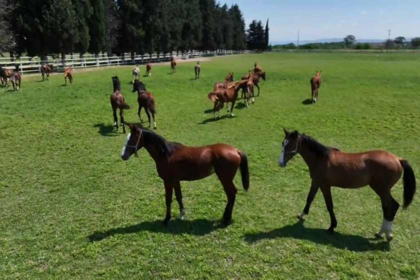 Bugün pistlerde koşan Arap atlarının yarısından fazlasını yetiştiren işletmede büyük bir titizlikle yetiştirilen Türk Arap atları drone ile görüntülendi. Her gün belli saatlerde açık alana salınan atların enerjilerini atmaları, koşuşturmaları ve birbirleriyle oynaşmaları görüntülere yansıdı.