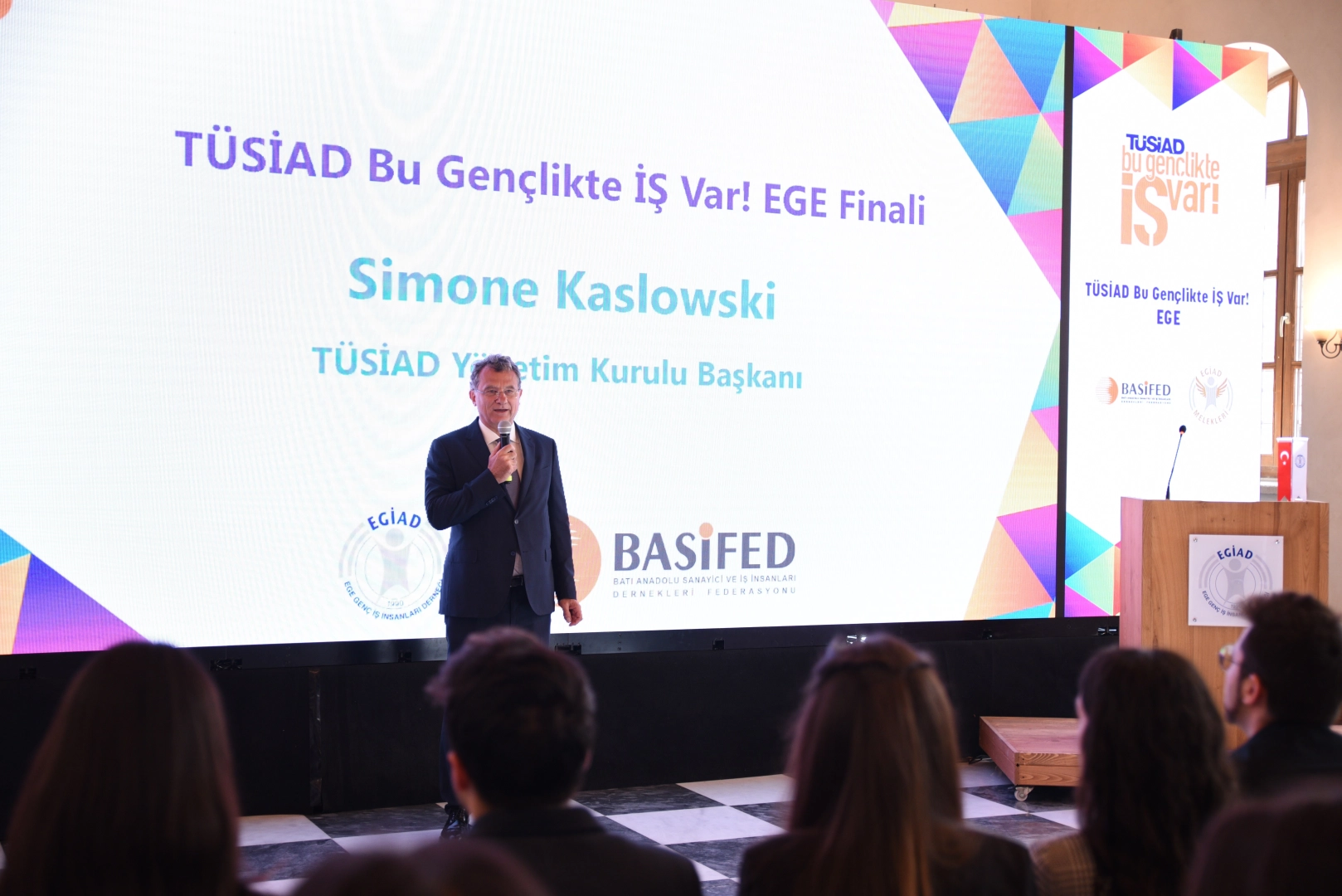 TÜSİAD Yönetim Kurulu Başkanı Simone Kaslowski ise konuşmasına, Türkiye’nin farklı bölgelerinden gelen birbirinden parlak genç girişimcilerin projelerini dinleyerek, Türkiye’nin geleceği için umutlandıklarını belirterek başladı. TÜSİAD Yönetim Kurulu Başkanı şunları söyledi: “TÜSİAD Bu Gençlikte İŞ Var! Ege paydaşlarımızla kurguladığımız ilk yerel programımız. Bu programın meyvelerini vermekte olduğunu görmek bizlere gurur veriyor. Hayalimiz bu programların nicelerini Türkiye’nin farklı bölgelerinde çalışır hale getirmek, genç girişimcilerimize geleceği yazmaları için daha çok destek vermek! Programa katılan tüm girişimcilerimizi cesaretleri, azimleri ve kararlılıkları için bir kez daha kutluyorum. Önümüzdeki senelerde de Ege’den daha nice başarılı girişimlerin çıkacağına olan inancımızı yenilemek istiyorum.”