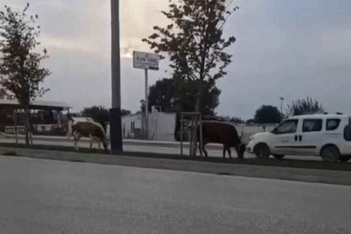 Olay, merkez Nilüfer ilçesi Çalı Yolu üzerinde meydana geldi. Başıboş ve nereden kaçtığı öğrenilemeyen 2 inek, yol ortasında bulunan refüj üzerinde seyretmeye başladı. Bir süre sonra acıkan inekler, orta refüjde bulunan otları yedi. Yolda inekleri gören vatandaşlar, o anları saniye saniye kayda aldı. Sürücüler ise hayvan sahiplerini göreve çağırdı.