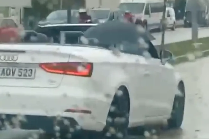 Bursa'nın merkez Nilüfer ilçesinde seyir halinde olan sürücü aracının açılır tavanını kapatamayınca yan koltukta oturan arkadaşı yağmurdan korunmak için farklı bir yönteme başvurdu. Şemsiye açarak seyahat eden sürücü ve arkadaşı, yoldan geçen diğer sürücüler ve yayalar tarafından şaşkınlıkla izlendi. Bazı vatandaşlar, sürücünün bu cesur ve eğlenceli hareketine gülerek tepki verirken, kimisi de o anları cep telefonu kamerasıyla kayda aldı.