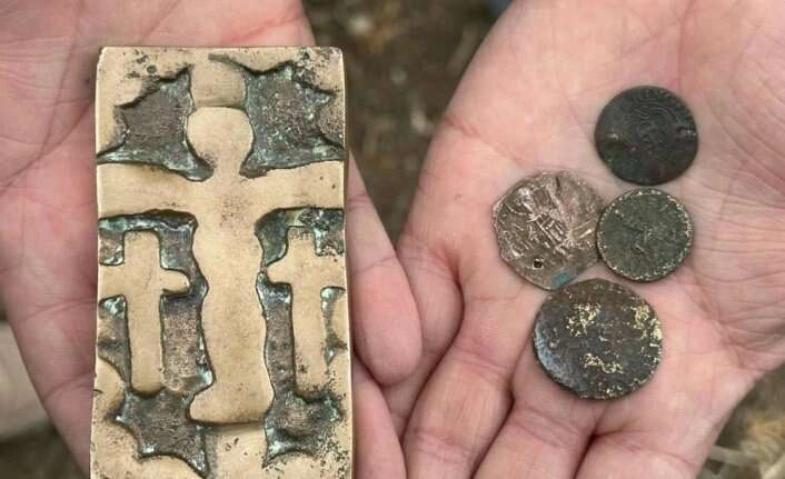 4 medeniyete başşehirlik yapmış Unesco’ya aday Bursa’nın İznik ilçesinde kendine ait şeftali tarlasında budama çalışması yapan Özkan Yılmaz, 4 adet sikke ve üzerinde haç ve çocuk kabartmaları bulunan tablete benzer tarihi bir parça buldu.