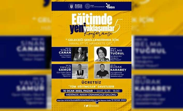 Büyükşehir Belediyesi’nin ‘Geleceği Şekillendirmek İçin Hayal Et ve Harekete Geç’ temasıyla bu yıl 5’incisini düzenleyeceği Eğitimde Yeni Yaklaşıklar Konferansı, 15 Ocak 2023 Pazar günü 12.30 – 18.00 saatleri arasında Atatürk Kongre ve Kültür Merkezi Osmangazi Salonu’nda gerçekleştirilecek. Bursa’daki tüm eğitimciler ve eğitime gönül verenlere açık olan ücretsiz konferansta, Prof. Dr. Sinan Canan, Prof. Dr. Belma Tuğrul, Doç. Dr. Yavuz Samur ve Doç. Dr. Burak Karabey, sunumlarıyla eğitim modellerinde yeni yaklaşımları ele alacak.