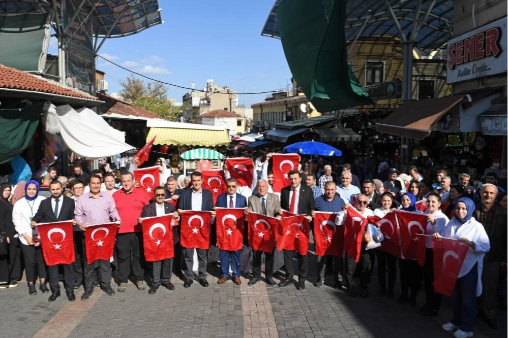 Osmangazi Belediyesi, Cumhuriyetin 100. yılı dolayısıyla ilçe genelini bayraklarla süslerken Belediye Başkanı Mustafa Dündar da esnafa Türk Bayrağı dağıttı.