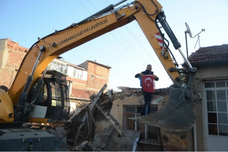 Osmangazi Belediyesi tarafından Küplüpınar Mahallesi’nde gerçekleştirilen metruk bina yıkımı esnasında çatıda duran Türk Bayrağı’nı zarar vermeden binadan alan iş makinası operatörü çevredekilerden alkış aldı.