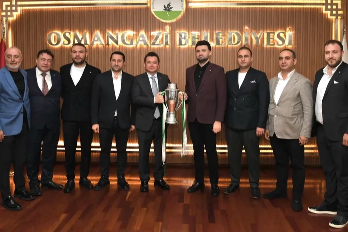 TFF 3. Lig 1. Grup’ta şampiyonluğunu ilan eden Bursaspor’un şampiyonluk kupasının bu defa ki durağı Osmangazi Belediyesi oldu. Osmangazi Belediye Başkanı Erkan Aydın, Bursaspor Başkanı Enes Çelik ve yönetim kurulu üyelerini başkanlık makamında şampiyonluk kupasıyla ağırladı. Başkanlar şampiyonluk kupasını beraber kaldırarak hatıra fotoğrafı çektirdi.