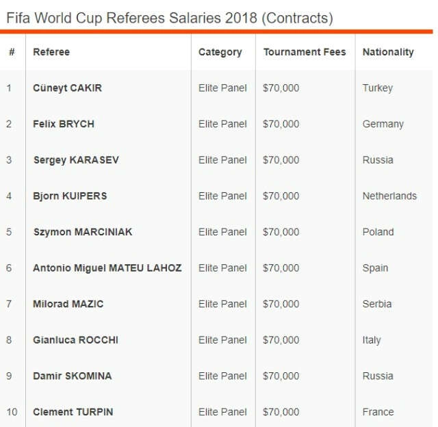2018 Dünya Kupasında düdük çalacak hakemlerin alacağı ücretler belli oldu. Buna göre Cüneyt Çakır katılım bedeli olarak 70 bin dolar, yönettiği maç başına ise 3 bin dolar alacak