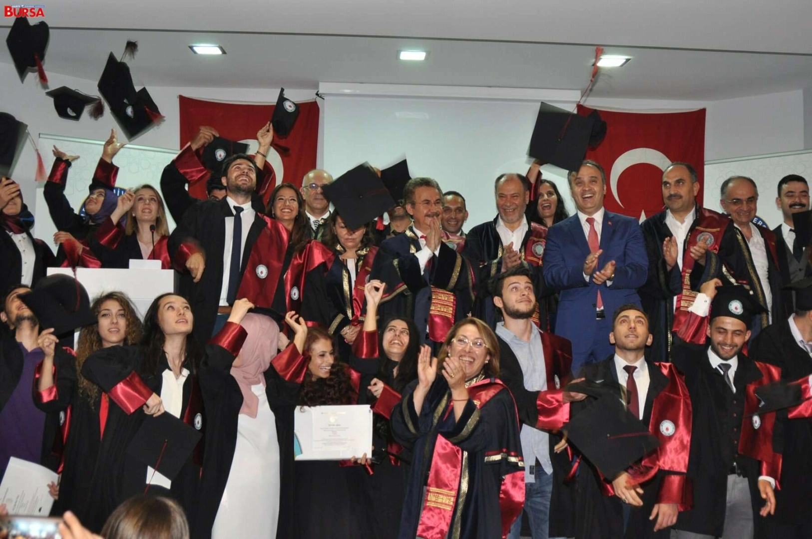 “Beynini kiraya veren hainlerin neler yapabildiğini hep beraber gördük” Uludağ Üniversitesi Rektör Yardımcısı Prof. Dr. Tevfik Yücedoğru, “Buruk bir sevinç yaşıyoruz. Beynini kiraya veren hainlerin memleketimizde neler yapabildiklerini hep beraber gördük. Allah beterinden saklasın. Üniversiteler bu anlamda önemli yerler. Geçmişte insanların saçına, sakalına, başörtülerine, ideolojilerine takıldık. Artık bunlar geride kaldı. Uludağ Üniversitesi de bu anlamda rotasına oturdu. Hiç kimseyi yaşayışından dolayı hor görmüyoruz. Şimdi birileri çıkmış benim gibi inanacaksın, benim gibi düşüneceksin, benim gibi yapacaksın diyor. Yapmazsan seni öldürürüm diyor. Hangi vicdan, hangi insaf tank savar füzesiyle insanın üzerine ateş eder. Tarihte hiçbir millet gelip bizim ülkemizin Genel Kurmayını işgal edebilmiş mi? Edememiş. Bu hainler işgal etmeye kalkıyor. Demek ki, bunlar Yunanlılardan daha kötü. Şerefli Türk askeriymiş. Gidip Yunanistan’a sığınıyor. Ve bir dini kullanarak bunu yapıyor. Maalesef hep beraber bunu yaşıyoruz. Hiç kimse bunu hak etmedi. Hiç kimse benim askerimin, milletimin bir başka evladı tarafından esirmiş gibi alınmasına vesile olacak davranışları yapmamalıydı. Eğitim dediler, din dediler insanları kandırdılar. İşte üniversiteler bunun için vardır. Dinin insanlara temin ettiği temel inanç sistemi değişmez” dedi Konuşmaların ardından okul birincisi Emine Sadıç, ikinci Pervin Aslan, üçüncü Esra Karataş’a mezuniyet belgeleri verilirken, Başkan Alinur Aktaş dereceye giren öğrencilere küçük altın hediye etti. Lisans ve Lisansüstü mezunları belgelerini aldıktan sonra keplerini havaya atarak mezuniyetlerini kutladılar.