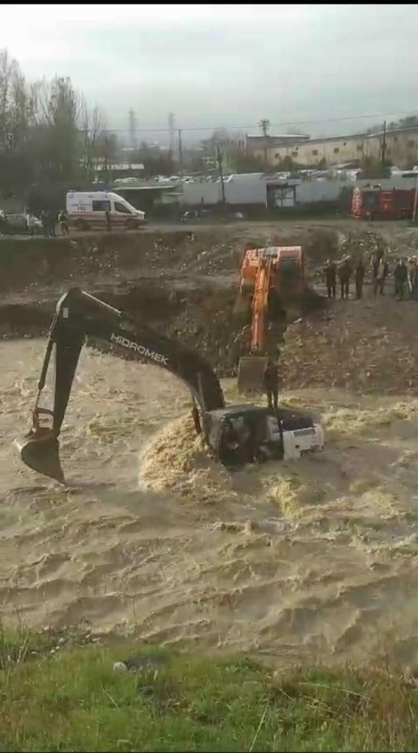 Aynı derede çalışan bir başka iş makinesinin kepçesini uzatmasıyla ayağı bile ıslanmadan kurtulan operatör, çevredekilere de derin bir nefes aldırdı.